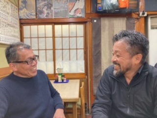 塩屋駅に着く頃には日が落ち、寂しい夜の駅前に居酒屋の明かりがポツリと灯るそれになっていた。しろちゃんの暖簾をくぐると友人夫妻が2人で宴会していた。ツレ夫妻の旦那は葉加瀬太郎な髭野郎、ワイフは関西では有名DJのカレンちゃん。10年前に塩屋に移住してローカルになって楽しんでる夫妻。ここは一緒に飲むとなり3人で乾杯となった。